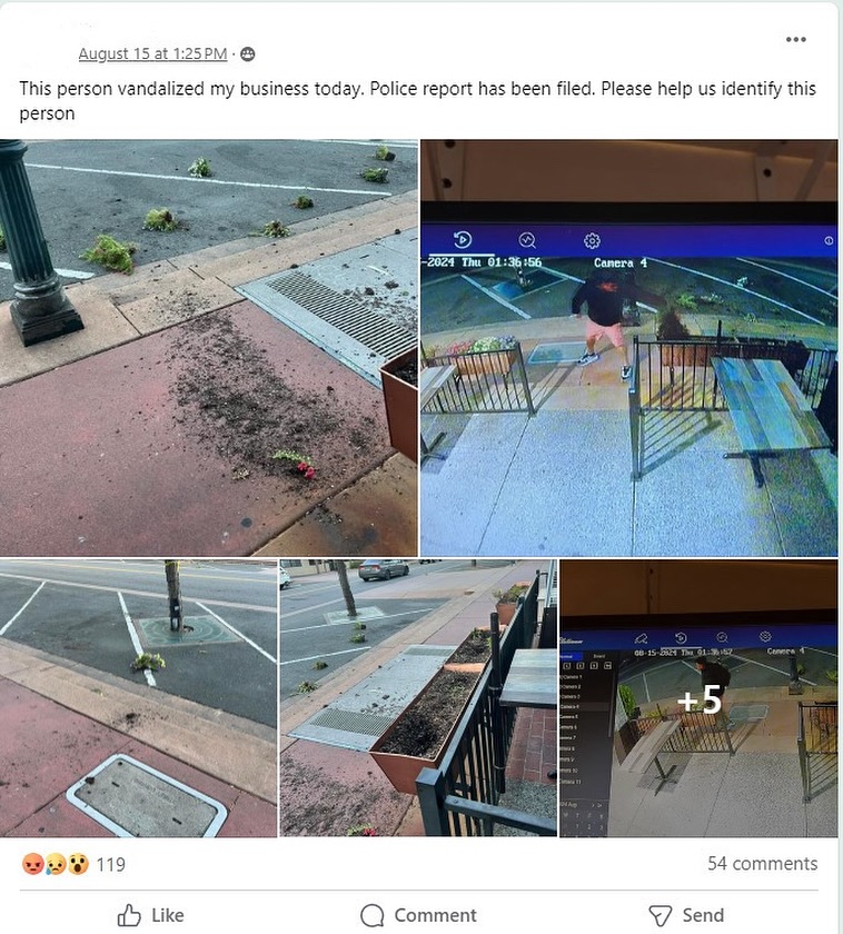 Last week, a vandalism report was submitted to the Novato Police Department by a local business owner on Grant Ave. The reporting party also posted surveillance photos of the incident to the Novato in the Know Facebook group, requesting assistance in identifying a suspect.