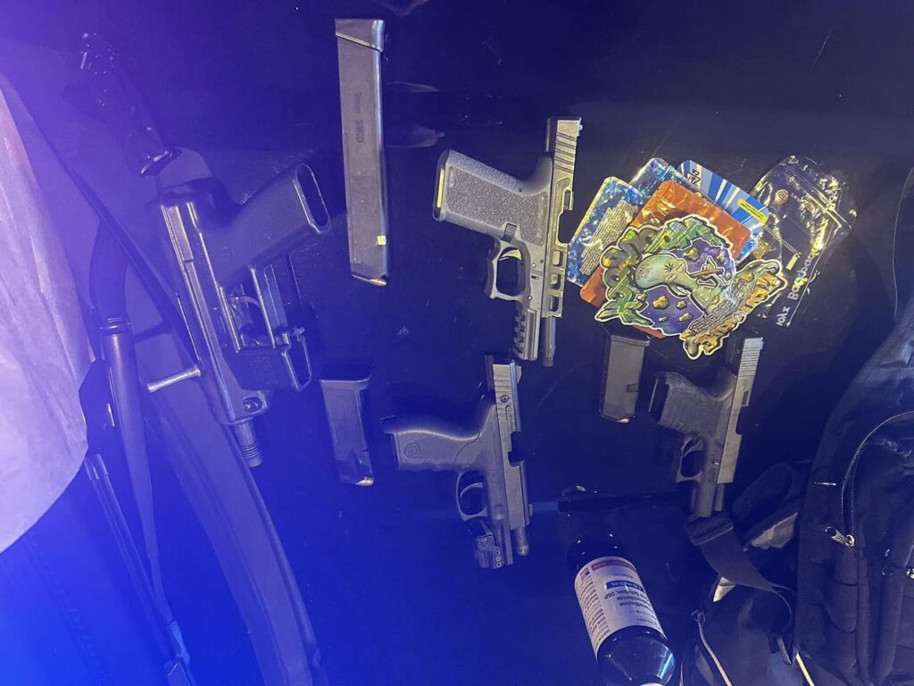 All three suspects attempted to run from the vehicle but were quickly captured without further incident. During the arrest of the suspects, one of them was found to be wearing a backpack that had three loaded handguns and one loaded assault weapon. One of the guns was determined to be a ghost gun, meaning that it was not serialized. Officers also found extended ammunition magazines.