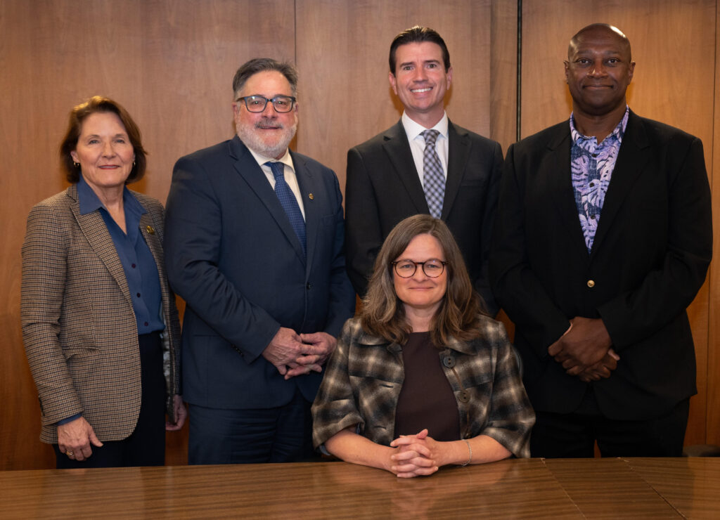 The Marin County Board of Supervisors members are (from left, standing) District 3’s Stephanie Moulton-Peters, District 4’s Dennis Rodoni, District 5’s Eric Lucan, District 2’s Brian Colbert, and (seated) District 1’s Mary Sackett, who is serving as Board President for 2025.