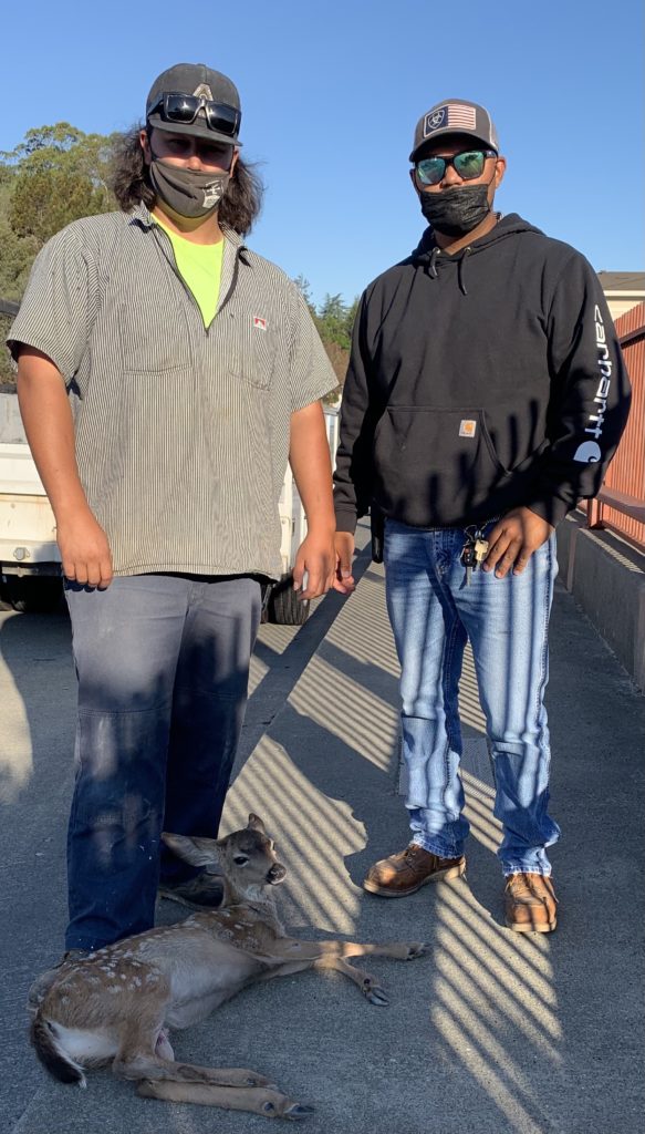 City workers Trevor Wong, left, and Mike Jones, rescued this fawn from the road at Novato Boulevard between Whole Foods and the 101. At about 6:30 a.m. Wednesday, June 17, they came across the animal,