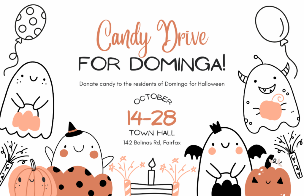 Halloween is just around the corner, and that means Dominga and Napa Avenue in Fairfax will soon be buzzing with excited trick-or-treaters. To support the fun Halloween activity on Dominga and Napa, where the bulk of the town’s trick-or-treaters go each year, we’re collecting candy at Town Hall.