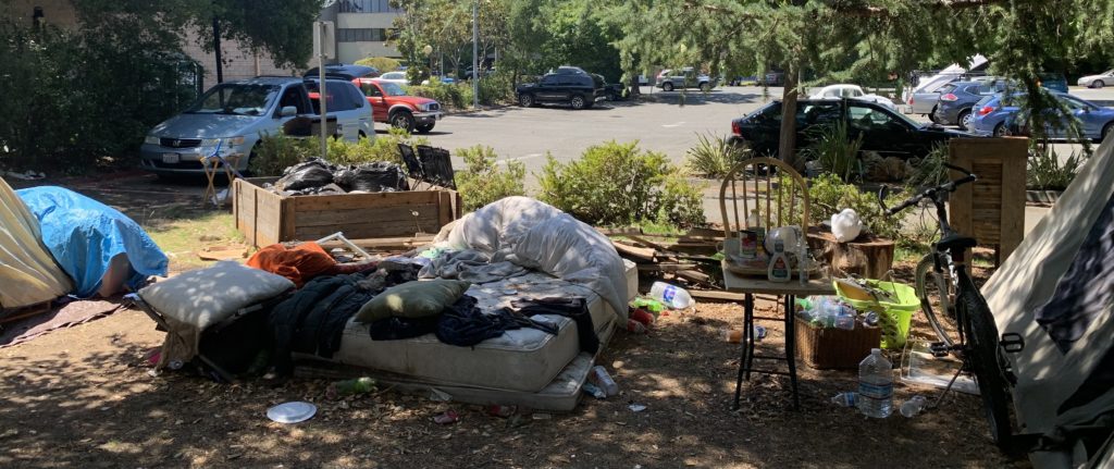 Novato hit the 100 degree mark on Thursday, June 17. It was especially brutal for the homeless camped out in Lee Gerner Park, below. The city is trying to find a better place for the homeless to be. The blankets piled atop this old mattress probably won’t be needed tonight.