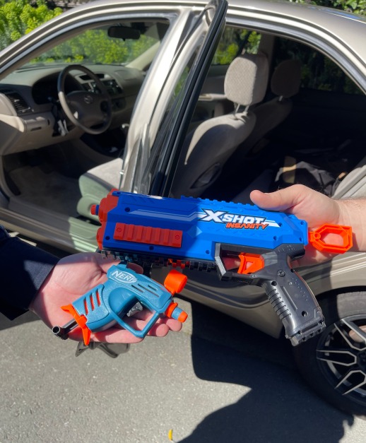 The school was contacted and placed into lockdown. Novato Police Officers located the teens involved. Investigation revealed that they were in possession of Nerf guns (see photo) and were participating in “Nerf gun wars” for a Senior Challenge.