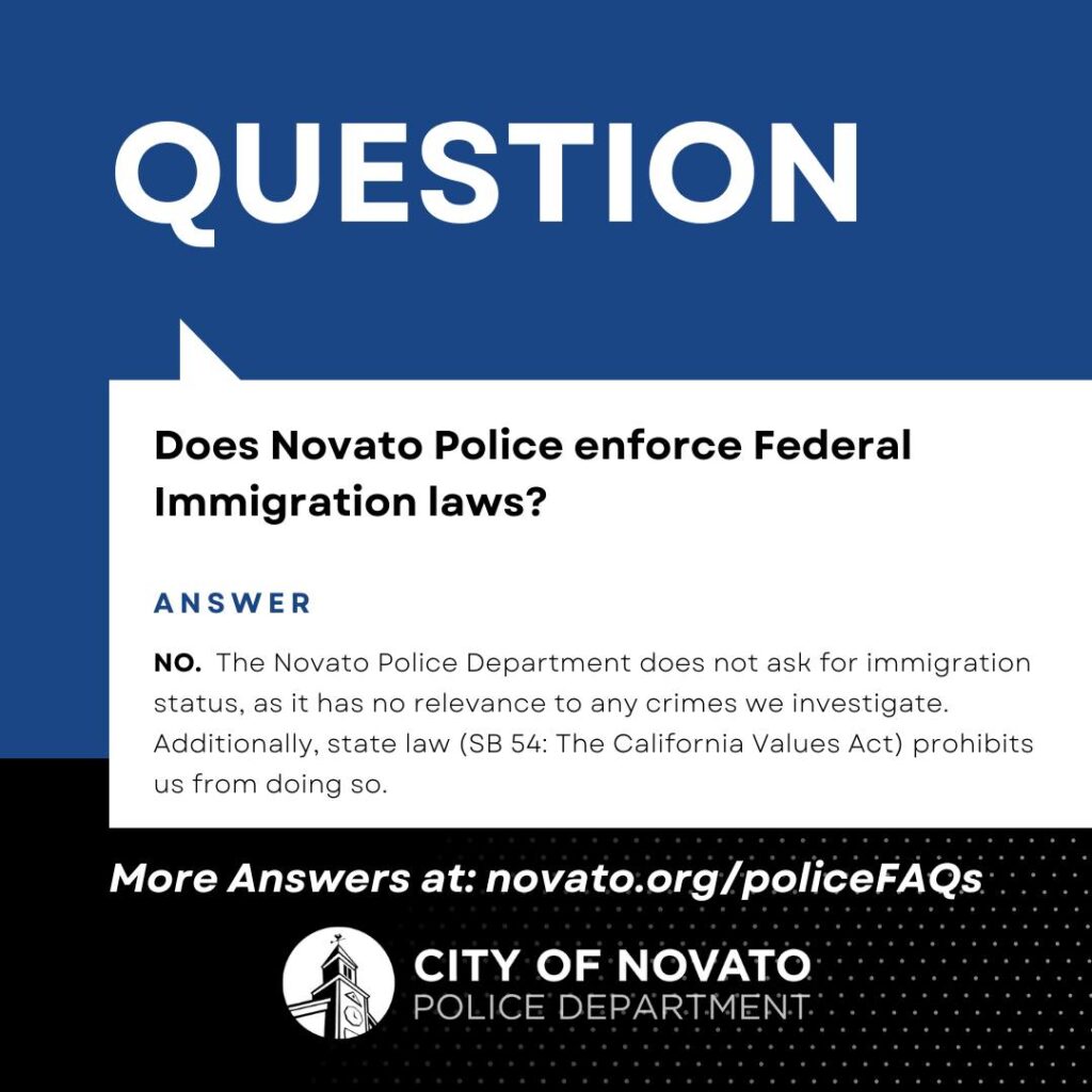 Novato police will not enforce federal immigration lawFebruary 18, 2025 by Marin Leave a CommentThe Novato Police Department posted this on the department’s website: