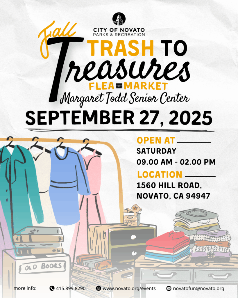 Shop for unique second-hand treasures at an indoor community flea market. The Margaret Todd Senior Center in Novato is hosting its Fall “Trash to Treasures” Flea Market on Saturday, September 27, from 9:00am – 2:00pm. The market is held indoors, rain or shine and admission is FREE! Food and other goodies will be available for purchase at the snack bar. This year more vendors have been added! Explore these newly added booths in a great new location inside the Senior Center.