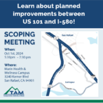 Dear Community Members, The Transportation Authority of Marin (TAM) and Caltrans invites you to participate in the upcoming scoping meeting for the US 101/I-580 Multi-Modal and Local Access Improvement Project. This project aims to reduce travel times between northbound US 101 and the … [Read more...] about Help plan the US 101/I-580 Multi-Modal and Local Access Improvement Project
