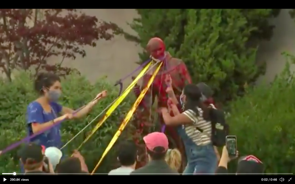 Red paint was thrown on the statue and straps were used to pull down the statue.