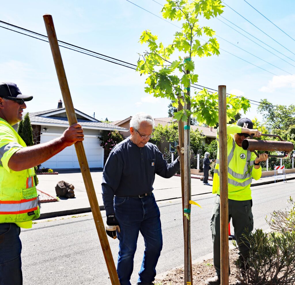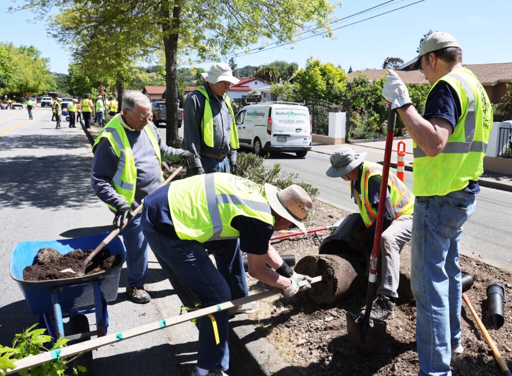 RCN Alan Dunham at wheel barrel initiated the tree planting idea for Wilson Ave Novato President Phil on right with shovel.