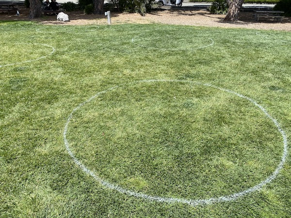 Spaced eight feet apart, the circles are 10 feet in diameter and provide a guide to creating a safe social distance between park users who want to relax on the lawn and enjoy the spectacular views of the bay.