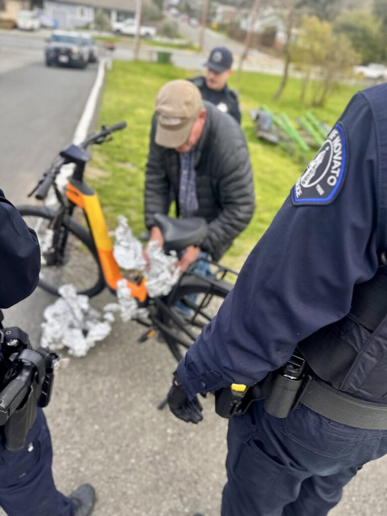 Last weekend, an E-bike was reported stolen from an open garage on Kenwood Ct. while the homeowners were inside their residence. Thanks to the e-bike’s tracking capabilities, Novato Police Officers were able to locate the bike at an RV parked on a neighboring street. The e-bike was found wrapped in tin foil as a failed attempt to block its tracking signal.